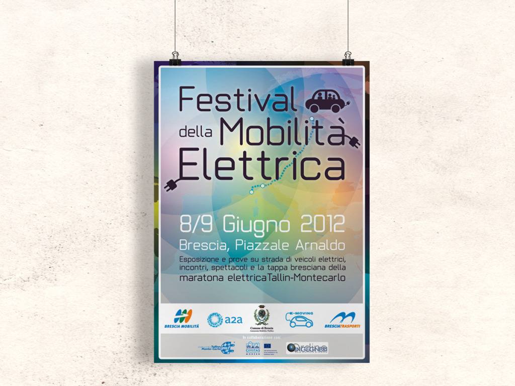 Una serie di manifesti pubblicitari e altro materiale promozionale per il Festival della Mobilità Elettrica di Brescia, in occasione della